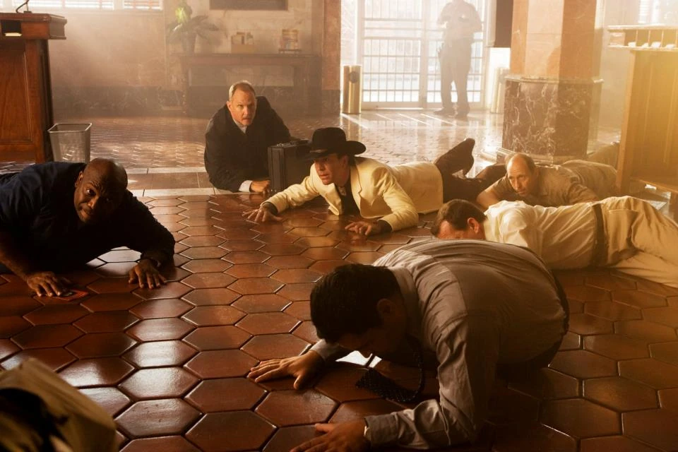 Eliot takes out the meth dealers and takes the money back to the bank. Hardison enters bank and talks to Roy, while making motions of surrender, i.e. putting his heads behind his neck and kneeling down in front of Roy. Then calling in the local police.