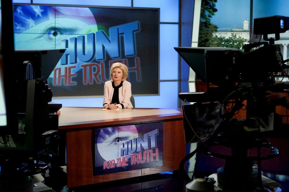 Monica Hunter, host of Hunt for the Truth, a fear-mongering daily television program on the BNI network. Monica builds her ratings, and feeds her audience fear, by demonizing innocent people, using a combination of manipulated facts, sensational video and "expert" commentary. Monica yearns for respect as a journalist, but is the butt of jokes among the community of serious journalists.